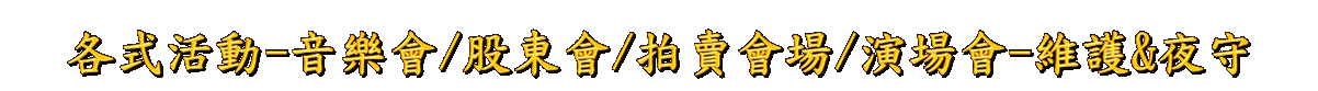 各類型股東大會、音樂會、臨時舞台、各型展場、展示會、防盜、防竊、防搶、夜間看守標的物、商品&器材….等,警方的力量往往無法有效益控制竊盜,以致於財產常遭受損失,公司特成立 — 會場保全維護 — ,平時教育訓練,訓練精良,來維護財產安全。 |